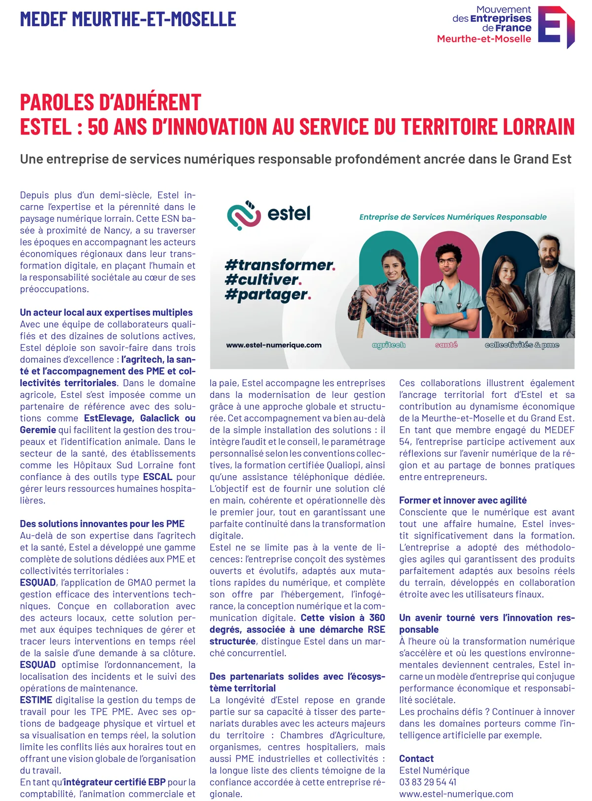 Ces collaborations illustrent également l’ancrage territorial fort d’Estel et sa contribution au dynamisme économique de la Meurthe-et-Moselle et du Grand Est. En tant que membre engagé du MEDEF 54, l’entreprise participe activement aux réflexions sur l’avenir numérique de la région et au partage de bonnes pratiques entre entrepreneurs.